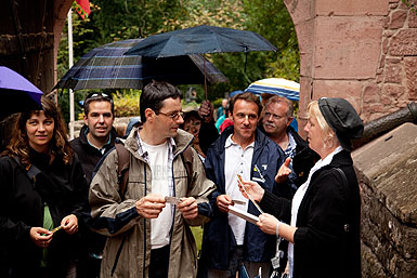 Auch die Organisation des Wetters hat bestens geklappt: Pünktlich beim Eintreffen auf dem 757 Meter hohen Sandsteinfelsen am Rande der Vogesen, auf dem die Hochkönigsburg erstmals im 12. Jahrhundert erblickt werden konnte, begann es zu regnen – und wir freuten uns über eine fast immer überdachte Burgführung, die uns einen besonderen Eindruck von der zu Beginn des 20. Jahrhunderts unter Kaiser Wilhelm II wieder aufgebauten, gigantischen Wehranlage vermittelte.