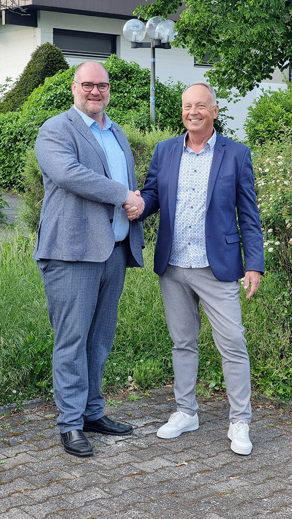 Foto: Bürgermeister Niels Starke gratuliert Volker Horn zur Neugründung der Volker Horn Versicherungsmakler GmbH. Foto: GVM