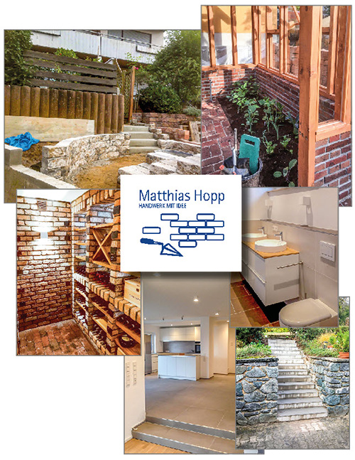Schaut man sich die Referenzbilder auf seiner Internetseite an, kann man dies sehen – besondere Mauerwerke, Bäder, Pools, Pflasterarbeiten, Durchbrüche, Treppen. Kurzum alles, was zur Verschönerung des Wohnens oder des Arbeitens beiträgt, modern oder mit südeuropäischem Flair. Matthias Hopp scheint vor guten Ideen zu sprudeln.